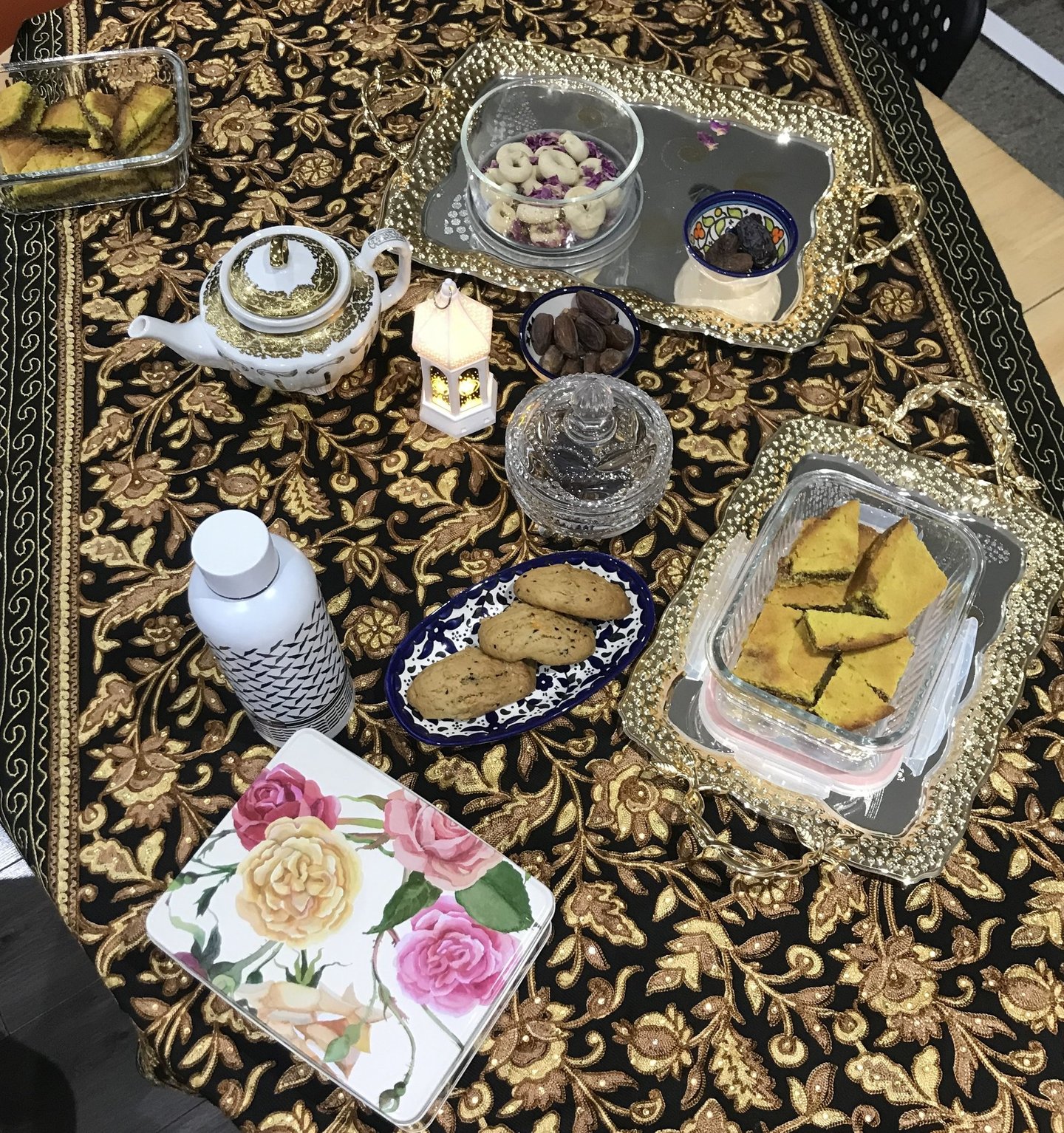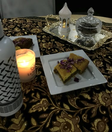Delicate Basbousa( Harissa with coconut), refreshing Apricot and Qamar al-Din beverages, and a luscious Marble Cake with Cinnamon or infused with Arabic Coffee.