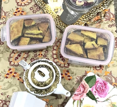 Our Basbousah is a rich and fragrant fabric of tradition, where fine semolina and flour weave together with fragrant coconut to form a perfectly moist, golden base. Once baked, it is generously crowned with our delicate sugar syrup, subtly scented with rose or or lemon juice, delivering an authentic and exquisite taste.