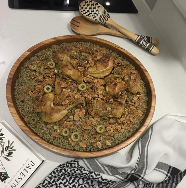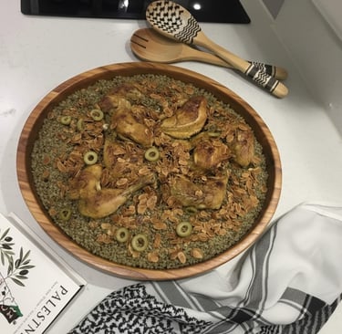 At the heart of the Palestinian table, the Freekeh Platter continues to enchant, a humble grain elevated into a harvest feast. The lightly roasted green wheat is first toasted to unlock its nutty depth, then gently simmered with tender chicken—creating a wholesome alternative to rice. Caramelised onions and aromatic Arabic spices mingle with the grains, each stirred slowly over the fire until the flavours harmonise. A splash of rich chicken broth, a scattering of toasted nuts, or glossy olives crowns the dish, turning it into a living celebration of the land’s bounty. Every bite carries the essence of fertile fields, the rhythm of harvest, and the warmth of shared tables — a true testament to the wisdom and generosity of Palestinian soil. Teta’s Palestinian Freekeh — the heart of the harvest on your plate.