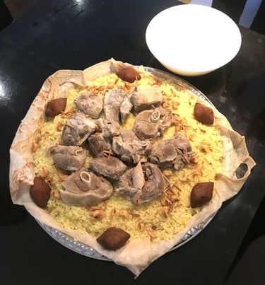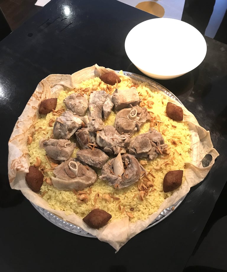 The dish begins with tender lamb, slow-cooked to perfection, resting upon a bed of golden rice subtly infused with the tang of fermented dried yoghurt, known as jameed. The surrounding air is filled with the delicate fragrance of Saj bread and the warm, nutty aroma of roasted nuts. The dish is crowned with thick, creamy yogurt, poured like velvet and finished with a drizzle of golden ghee — creating a harmonious balance of taste, and texture. Every component is deliberate, every detail reflective of centuries of care, devotion, and culinary mastery.